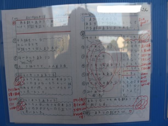 算数の学習では、ノートの使い方を決めており、めあてや見通し、自分の考えや友達と話し合って見つけたよりよい考えなどを書いています。