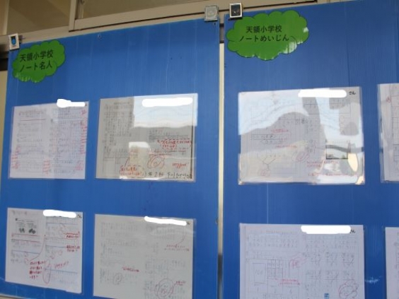 職員室の前には「ノート名人コーナー」があり、ノートのとり方の参考となる人のノートが掲示されています。