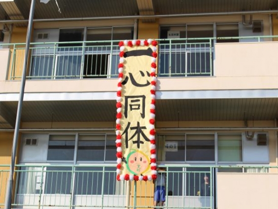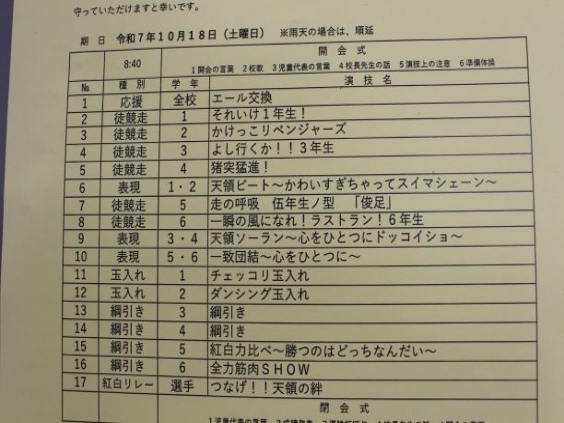 5年生と6年生は、明日の運動会の準備を協力しながら行いました。 今年の運動会のスローガン「一心同体」を校舎から下げたり、綱引きの綱を片付けたりしました。 自分の役割の仕事を一生懸命最後までやり遂げてくれました。 最後には、安全に演技できるようにみんなで石拾いをしました。 明日は、午後から雨が降るとの予報が出ています。 プログラムを変更して行います。 今年の運動会がよき思い出になることを願っています。