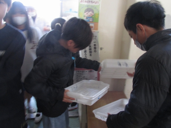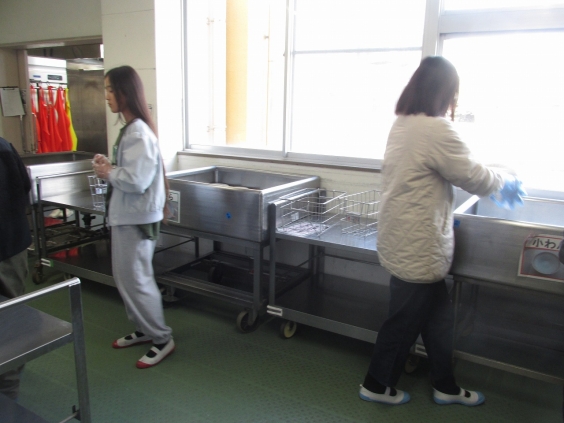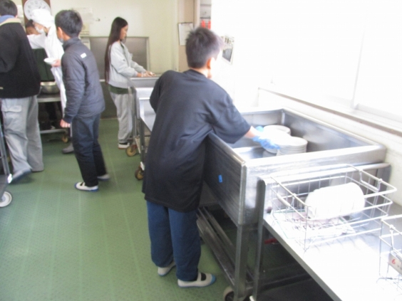 給食委員会の子ども達は、みんなが返しに来る食器を種類別にシンクにいれていきます。
