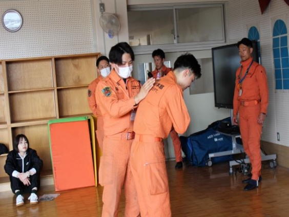 大牟田市消防本部より5名の講師を招いて、エピペンの使い方、胸骨圧迫の仕方、AEDの使い方、のどに物が詰まったときの対処法、児童がやけどをしたときの対処法を学びました。