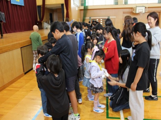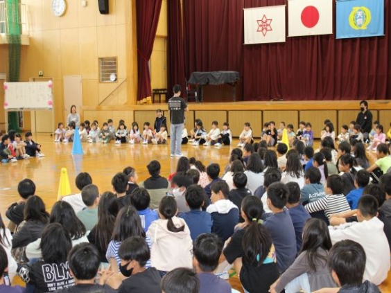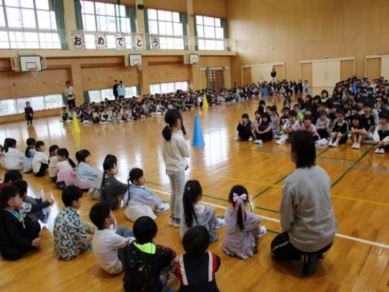 1年生の入学を祝って歓迎集会が行われました。 1年生は、自分が好きな食べ物やキャラクターなどを緊張しながらも堂々と発表することができました。とても立派でした。 歓迎の言葉では、6年生代表の児童が1年生の入学を歓迎するメッセージをユーモアたっぷりに発表し、1年生はとても喜んでいました。 「さんぽ」の歌では、6年生が振付をしながら楽しそうに歌い、場の雰囲気を盛り上げてくれました。 1年生は、人の話を聞く態度が素晴らしかったです。 6年生は、相手のことを考えて行動する姿がいたるところで見られました。