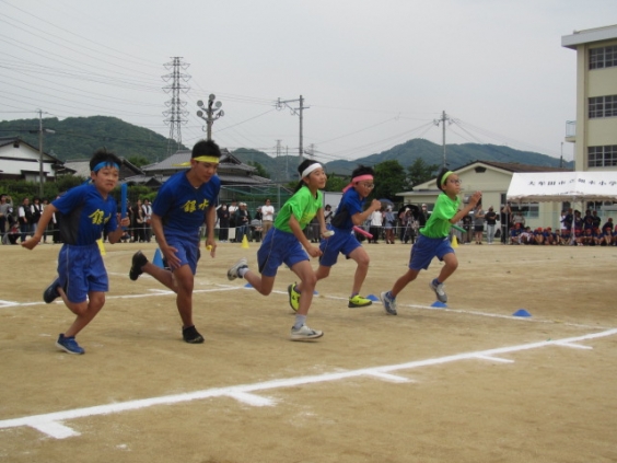4〜6年生は、給食後、バスに乗って銀水小まで行き、学級対抗リレーと学年対抗リレーに全児童が出場しました。