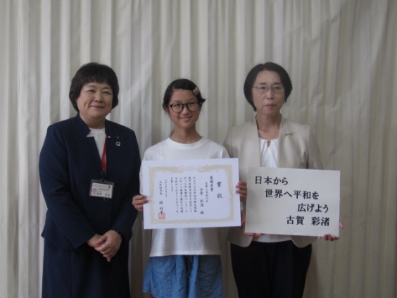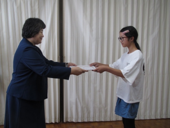 6年の古賀さんがつくった平和標語「日本から世界へ平和を広げよう」が最優秀賞に選ばれ、副市長さんに来校していただき、授賞式が行われました。