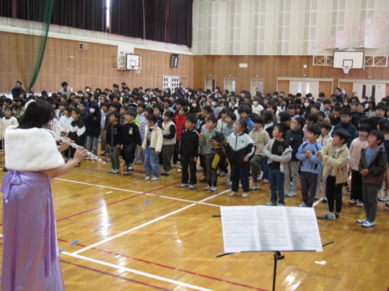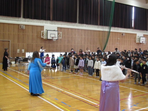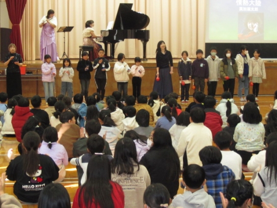 今日は、大牟田市音楽家協会の皆様に来校いただき、音楽鑑賞会を行いました。 ピアノ演奏や歌とフルート、ソプラノ独唱など、盛りだくさんに演奏していただきました。代表児童が楽器を持って演奏したり、体を使って全員で演奏したりと、聴くだけでなく体を動かして楽しむことができました。 初めて聴くピアノやフルートの演奏、素敵な歌声に心地よい気持ちになりました。 子供たちが「音楽って楽しい!」という気持ちをもってくれたらなと思います。