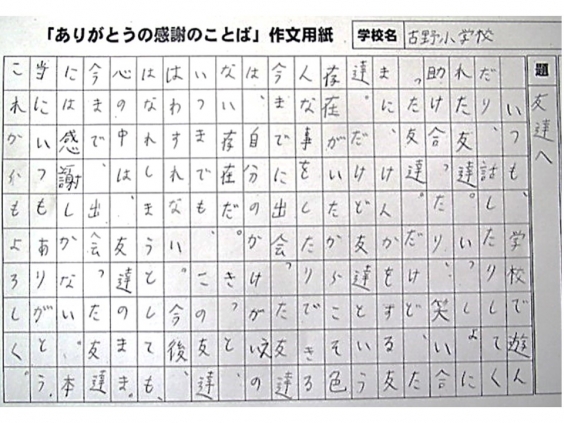 今週は、ありがとう作文を給食時間に代表者が放送してくれています。 ありがとう作文は、全校児童が感謝の気持ちを伝えたい人に向けて、200文字で書いた作文です。 親や友達、祖父母や兄弟姉妹に向けて、日頃は言葉で言えないことを作文で思いを伝えています。 どの子も気持ちのこもった作文を書いていました。 「ありがとう」と素直に言える子どもに育ってほしいです。
